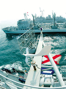 此次演練中,補(bǔ)給演練尤其引人注目。當(dāng)中方指揮員張盤洪少將下達(dá)補(bǔ)給命令后,“哈爾濱”號(hào)、“拉圖什特威爾”號(hào)和“比羅司令”號(hào)3條戰(zhàn)艦呈倒品字形圍繞“洪澤湖”號(hào)航行,先后進(jìn)行了3艦同時(shí)補(bǔ)給和單艦補(bǔ)給模擬演練。據(jù)了解,補(bǔ)給演練內(nèi)容是延長(zhǎng)戰(zhàn)斗力的訓(xùn)練課目,是檢驗(yàn)海軍遠(yuǎn)海聯(lián)合作戰(zhàn)能力的訓(xùn)練。