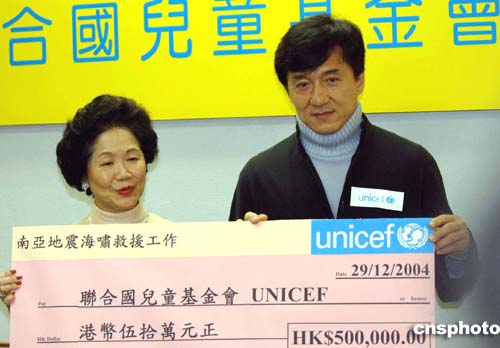 香港多個民間救援機構(gòu)陸續(xù)發(fā)起籌款活動,為南亞海嘯災(zāi)難捐款,12月29日,國際影星成龍在香港認捐五十萬元予聯(lián)合國兒童基金會。作者:洪少葵