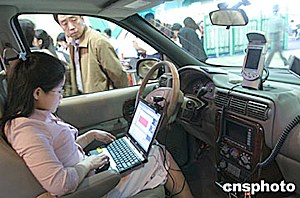 五月中旬,在北京科技周展覽會(huì)上,一種可在移動(dòng)的汽車(chē)上完成全套辦公業(yè)務(wù)的“車(chē)載辦公室”向觀眾亮相!败(chē)載辦公室”有無(wú)線網(wǎng)絡(luò)、衛(wèi)星導(dǎo)航、傳真打印等各種配置。中新社記者:史利