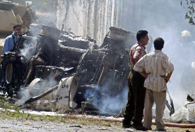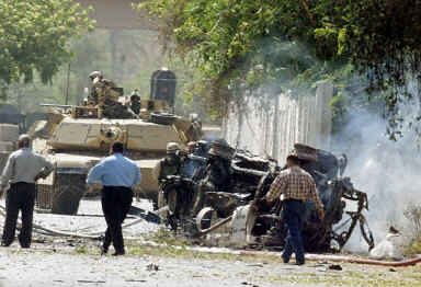 自從美軍進駐巴格達后,汽車爆炸似乎成了家常便飯,救援工作也因此變得駕輕就熟。薩利姆的汽車被炸后不久,數(shù)輛救護車便趕到了現(xiàn)場,戴著面具和橡膠手套的救援人員迅速行動起來,從被汽車殘體里往外拖那些已經(jīng)被燒得血肉模糊的尸體。聞訊而來的記者們看到,現(xiàn)場現(xiàn)場散落著鞋子和碎尸,一只被炸斷的腳恐怖地掛在30米以外的錢絲網(wǎng)上。