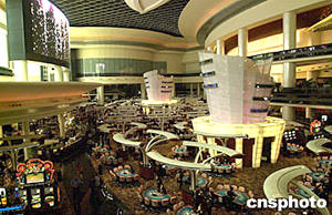 首間來(lái)自美國(guó)拉斯韋加斯大型娛樂場(chǎng)酒店“金沙娛樂場(chǎng)”十八日在澳門開幕,這間具有美國(guó)拉斯韋加斯風(fēng)格的娛樂場(chǎng)空間高大寬敞,現(xiàn)設(shè)二百七十七張賭桌、四百零五部角子老虎機(jī)。中新社記者:李剛