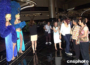 首間來(lái)自美國(guó)拉斯韋加斯大型娛樂場(chǎng)酒店“金沙娛樂場(chǎng)”十八日在澳門開幕,來(lái)自美國(guó)拉斯韋加斯的艷舞女郎在現(xiàn)場(chǎng)迎接客人,使澳門市民及游客大開眼界。中新社記者:李剛