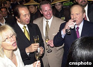 首間來(lái)自美國(guó)拉斯韋加斯大型娛樂場(chǎng)酒店“金沙娛樂場(chǎng)”十八日在澳門開幕,澳門“賭王”何鴻燊親自到場(chǎng)向金沙高層人士表示祝賀。中新社記者:李剛