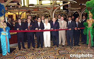 首間來(lái)自美國(guó)拉斯韋加斯大型娛樂場(chǎng)酒店“金沙娛樂場(chǎng)”十八日在澳門開幕,澳門特區(qū)經(jīng)濟(jì)財(cái)政司司長(zhǎng)譚伯源、運(yùn)輸工務(wù)司司長(zhǎng)歐文籠與拉斯韋加斯金沙公司董事會(huì)主席肖登˙艾德森、拉斯韋加斯金沙公司總裁兼運(yùn)營(yíng)總監(jiān)威廉懷德等為開幕式剪彩。中新社記者:李剛