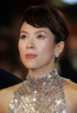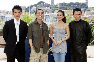 5月19日,中國電影導(dǎo)演張藝謀(左二)、女影星章子怡(右二)、男影星金城武(左)和香港老牌影星劉德華一起出席影片《十面埋伏》在法國南部影城戛納的首映式。