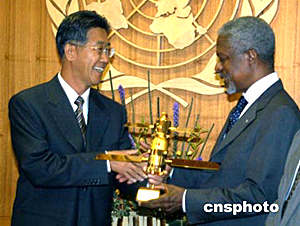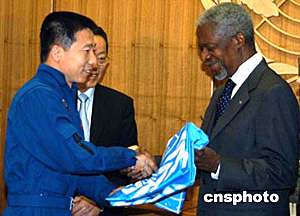 中國首飛航天員楊利偉(左)代表中國,向聯(lián)合國秘書長安南(右)移交了“神舟”五號飛船所攜載的聯(lián)合國旗。作者:陳建