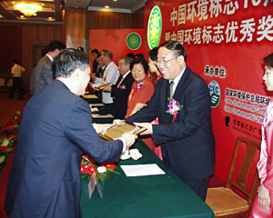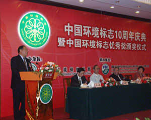 在慶典儀式上,國家環(huán)境總局向獲得中國環(huán)境標志優(yōu)秀獎和促進獎的中外企業(yè)頒獎。聯(lián)合國環(huán)境署、德國藍色天使、歐洲歐盟之花、北歐白天鵝、日本生態(tài)標簽、韓國環(huán)境標志、瑞典III型標志、全球環(huán)境標志網(wǎng)絡等國際組織的專家以及全國政協(xié)、全國人大、國家發(fā)改委、商務部等政府、科研和企業(yè)機構代表三百余出席了慶典。