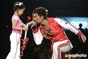 “齊長(zhǎng)大”任賢齊北京演唱會(huì)五月二十二日晚在首都體育館舉行,演唱會(huì)的高潮出現(xiàn)在“香車美女”環(huán)節(jié),任賢齊為一名5歲的小美女單膝跪地送上玫瑰并騎上摩托帶她環(huán)場(chǎng)一周。中新社記者:高遠(yuǎn)