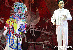 為紀(jì)念中國(guó)最著名的京劇大師梅蘭芳先生誕辰一百一十周年,北京京劇院演出的京劇大型交響劇詩(shī)《梅蘭芳》五月二十五日晚走進(jìn)北京大學(xué)百年講堂,如詩(shī)如畫(huà)的舞臺(tái)設(shè)計(jì)和京劇藝術(shù)家們精湛的演技贏得大學(xué)生的陣陣喝彩。京劇大型交響劇詩(shī)《梅蘭芳》擷取了抗日戰(zhàn)爭(zhēng)期間梅蘭芳蓄須明志,拒絕為日本人演出的人生片段。圖為由北京京劇院于魁智(右)扮演的梅蘭芳先生。中新社記者:張勤