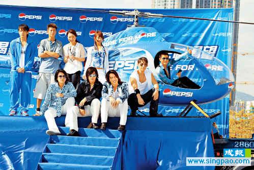 在直升機場上,先安排九位巨星為“百事”小型直升機進行揭幕儀式,又與直升機合照!俺浅恰弊R搶位,第一時間沖入直升機坐上機師位,其它巨星就只是在飛機旁合照。