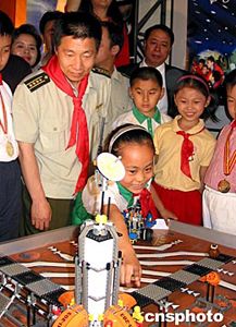 六月一日,一位小航天迷在北京中國(guó)兒童中心向航天飛行員楊利偉介紹機(jī)器人火星探險(xiǎn)車。當(dāng)天,楊利偉在孩子們的簇?fù)硐鲁鱿艘浴皩W(xué)習(xí)科學(xué)文化知識(shí),發(fā)展祖國(guó)航天事業(yè)”為主題的兒童科技活動(dòng),與孩子們一起歡度“六一”。中新社記者:王歡