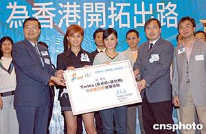 香港專業(yè)進(jìn)修學(xué)校(簡稱港專)與香港電臺6月1日在香港舉行《全職青年---創(chuàng)意空間》記者會,校董會主席譚耀宗(左)及校長陳卓禧(右二)于儀式上邀請Twins為「創(chuàng)意空間」出任榮譽(yù)導(dǎo)師,并協(xié)助年輕人釋放潛能,實(shí)現(xiàn)他們的理想。作者:鄧慶樂