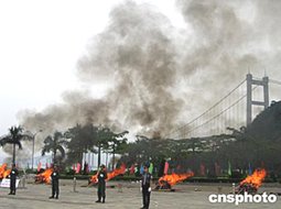 六月三日,廣東有關(guān)部門在虎門現(xiàn)場(chǎng)銷毀了一百六十五公斤毒品,以紀(jì)念民族英雄林則徐虎門硝煙一百六十五周年。廣東虎門現(xiàn)在是全國禁毒教育基地。作者:楊伏山