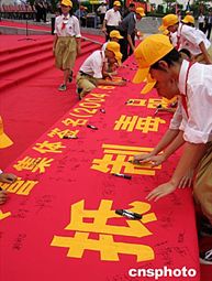 適逢民族英雄林則徐虎門硝煙一百六十五周年,福建省和廣東省禁毒辦聯(lián)袂在虎門主辦閩粵港澳臺(tái)青少年禁毒夏令營活動(dòng)。圖為閩粵港澳臺(tái)青少年學(xué)生集體簽名,對(duì)毒品說“不”。作者:楊伏山