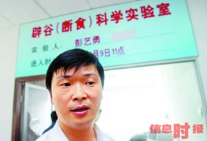 據(jù)彭先生介紹,1996年他曾在工廠里自行絕食過53天。開頭的幾天內,感到很難受,到了第四天以后,饑餓感消失,而且感覺很舒服,思維、行動變得敏捷靈活了。“只要掌握足夠的醫(yī)學理論,絕食60天絕對沒有問題!迸硐壬@得非常自信地說。