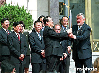 中新網(wǎng)6月9日電 今天上午9時,2004年雅典奧運會火炬北京傳遞活動在北京正式開始;顒悠瘘c設(shè)在人民大會堂東門外廣場,傳遞途中設(shè)立148個接力點,終點設(shè)在頤和園。