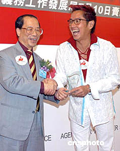 歌星譚詠麟6月9日在香港出席義務(wù)工作發(fā)展局舉行《全民義工參與賣(mài)旗日‧榮譽(yù)義工大使委任儀式》,義務(wù)工作發(fā)展局主席李澤培向譚詠麟致送紀(jì)念品。