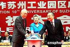 六月十日上午,數(shù)千中外嘉賓歡聚在蘇州金雞湖畔,熱烈慶祝中國--新加坡合作蘇州工業(yè)園區(qū)成立十周年。中國國務(wù)院副總理吳儀和中新兩國當(dāng)年的簽約人李嵐清、新加坡內(nèi)閣資政李光耀出席會議并共同啟動慶;顒影粹o。作者:蔣振江