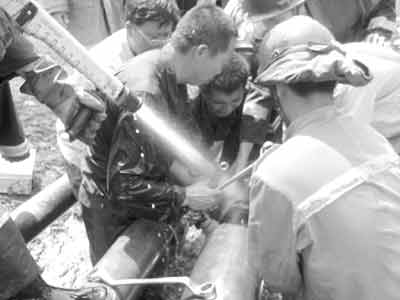 據(jù)朝陽市消防局副局長姚安介紹:“我們共出動70余名官兵、10臺消防車。由于汽油管道發(fā)生炸裂,引起了另一條柴油輸送管道的法蘭盤(管道的接頭)向外泄漏柴油,現(xiàn)在這7條輸油管道每條里都有5噸油,一旦引爆后果不堪設(shè)想。我們用兩臺泡沫滅火車和若干水槍給管道降溫,同時(shí)用來稀釋泄漏的柴油,并更換法蘭盤。”