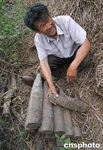 十九日十時(shí)左右,有關(guān)專家趕到了賈衍教家。經(jīng)過(guò)初步鑒定,賈家的炮彈均和頭站村日軍遺留毒氣彈相同。有關(guān)負(fù)責(zé)人告訴賈衍教:“千萬(wàn)不要?jiǎng)优趶,也不要讓人靠近炮彈,幾天之?nèi)將有專人將這些毒氣彈運(yùn)走!