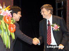 微軟公司董事長(zhǎng)兼首席軟件架構(gòu)師比爾·蓋茨,7月1日出席在北京舉行的2004微軟新技術(shù)展望大會(huì),并為2500余名大學(xué)生及2000位軟件開(kāi)發(fā)人員演講,并共同探討未來(lái)無(wú)縫計(jì)算的發(fā)展趨勢(shì)。圖為微軟亞洲研究院院長(zhǎng)沈向洋(左)與比爾·蓋茨握手。中新社記者:張宇
