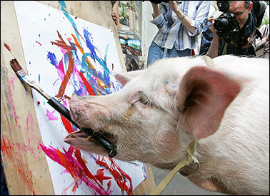 “豬的藝術(shù)”:一只被稱作“Malevich”的小豬在莫斯科市區(qū)“作畫”,這是當(dāng)?shù)厮囆g(shù)家展示動(dòng)物繪畫技藝的一部分。