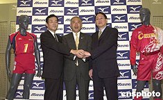 日本體育用品代表企業(yè)美津濃7月6日在東京展示贊助中國(guó)女排(圖左)與中國(guó)女壘(圖右)參加雅典奧運(yùn)的比賽用服,并宣布將在北京奧運(yùn)會(huì)之前的四年內(nèi)加大投資中國(guó)的力度,爭(zhēng)取占得更大市場(chǎng)份額。作者:王健