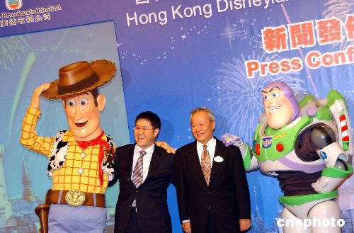 香港迪斯尼樂園及電視廣播有限公司7月14日聯(lián)合舉行新聞發(fā)布會,宣布推出一系列迪斯尼動畫及電影,圖為迪斯尼電影卡通人物巴斯光年與胡迪出場助興。作者:洪少葵