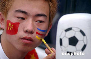七月十七日,二零零四年亞洲杯足球賽揭幕戰(zhàn)將在中國(guó)隊(duì)和巴林隊(duì)之間展開(kāi),一位中國(guó)球迷認(rèn)真描畫(huà)臉譜,為中國(guó)隊(duì)加油。中新社記者:武仲林