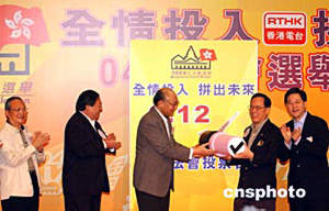 政務(wù)司司長曾蔭權(quán) 、政制事務(wù)局局長林瑞麟、民政事務(wù)局局長何志平、選舉管理委員會(huì)主席胡國興大法官及立法會(huì)議員、區(qū)議會(huì)正、副主席、選舉大使等出席典禮。  2004年香港立法會(huì)選舉開幕典禮17日在文化中心大堂舉行﹐政制事務(wù)局局長林瑞麟介紹選票。