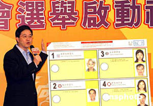 政務(wù)司司長曾蔭權(quán)(右二) 、政制事務(wù)局局長林瑞麟(右一) 、民政事務(wù)局局長何志平(左二) 、選舉管理委員會(huì)主席胡國興大法官(中) 主持立法會(huì)選舉開幕典禮并為選票加蓋印。