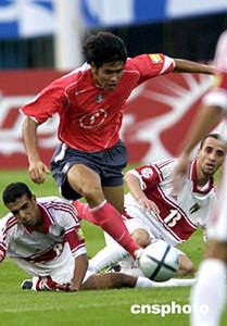 7月19日晚,2004年亞洲杯B組比賽在濟(jì)南開戰(zhàn),歷史上首次進(jìn)入亞洲杯決賽圈的約旦隊(duì)迎戰(zhàn)2002年世界杯四強(qiáng)之一的韓國隊(duì)。中新社記者:武仲林