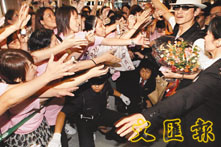 中新網(wǎng)7月27日電 據(jù)香港文匯報(bào)報(bào)道,劉德華昨早飛往日本為《十面埋伏》展開(kāi)宣傳,雖然他乘坐的班機(jī)要到下午四時(shí)半才抵達(dá)日本機(jī)場(chǎng),但其三百名歌影迷卻早在下午一時(shí)已到機(jī)場(chǎng)等候偶像。而機(jī)場(chǎng)方面的保安,見(jiàn)到如此多Fans也被嚇著,當(dāng)知道是華仔即將到達(dá)時(shí),立即加派十五名保安,并架起圍欄限制歌迷等候的位置,以免造成混亂。