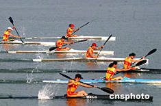 中國國家皮劃艇隊(duì)女子皮艇運(yùn)動員七月二十七日在山東日照水庫訓(xùn)練基地進(jìn)行奧運(yùn)賽前模擬實(shí)戰(zhàn)訓(xùn)練,備戰(zhàn)雅典奧運(yùn)會。作者:張勤