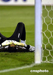 7月27日晚,亞洲杯B組科威特隊(duì)、韓國(guó)隊(duì)生死爭(zhēng)奪戰(zhàn)在濟(jì)南山東省體育中心舉行,最終科威特以0比4負(fù)于韓國(guó)隊(duì),無(wú)緣八強(qiáng)。圖為四度被洞穿球門(mén)的科威特門(mén)將懊惱不已。中新社記者:武仲林