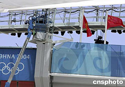 當?shù)貢r間8月2日中午,驕陽映照正在緊張排練奧運會開幕式的希臘雅典奧運會主會場。國際奧委會所有會員的旗幟在體育場四周依次排列,鮮艷的中國國旗在體育場西南方向迎風飄揚。中新社記者:任晨鳴
