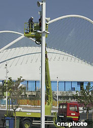 雅典奧運會主體育場外的收尾工程當(dāng)?shù)貢r間8月13日緊張進(jìn)行,工人們冒著烈日安裝擴(kuò)音設(shè)施。中新社記者:任晨鳴