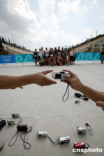 奧運(yùn)大戰(zhàn)前夕,新西蘭女子曲棍球隊8日在著名的大雅典運(yùn)動場前合影留念,十幾臺數(shù)碼照相機(jī)一字排開,使攝影師成為最忙碌的人。中新社記者:王瑤