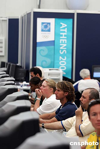 當?shù)貢r間八月八日,參加雅典奧運會的選手上網(wǎng)娛樂。中新社記者:毛建軍