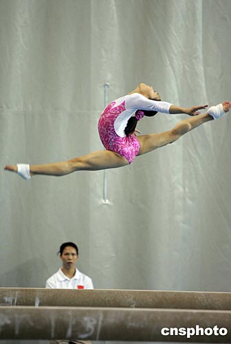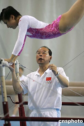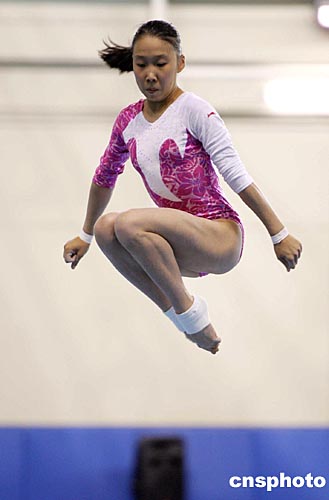當?shù)貢r間八月九日,中國女子體操隊在希臘雅典奧運會體操館進行賽前訓練。