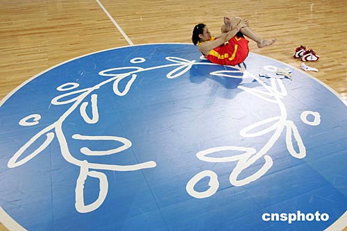 當?shù)貢r間八月十日,中國女籃進行從克里特島抵達雅典后的首場訓(xùn)練,宋曉云訓(xùn)練結(jié)束后在有雅典奧運會徽的中圈弧內(nèi)進行放松運動。作者:毛建軍