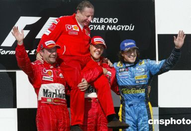 中新網(wǎng)8月16日電 今年的匈牙利大獎賽再一次成為了法拉利車隊的表演賽。大舒馬赫和巴里切羅包攬了前二名。大舒馬赫以1小時35分26秒131的成績,取得他今年第12個分站冠軍并幫助車隊提前5站取得年度冠軍。