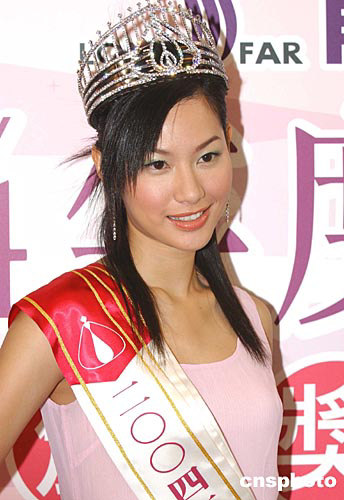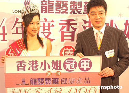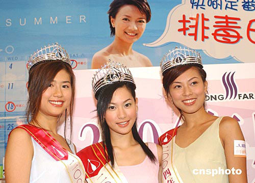 2004年度香港小姐冠軍徐子珊﹑亞軍朱慧敏﹑季軍符思思16日在會(huì)展中心出席香港龍發(fā)制藥集團(tuán)頒獎(jiǎng)儀式。中新社記者:趙振清