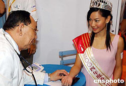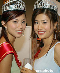 2004年度香港小姐冠軍徐子珊、亞軍朱慧敏、季軍符思思,八月十六日參加在香港會展中心舉行的美食博覽展,為一家制藥商造勢。中新社記者:錢興強(qiáng)