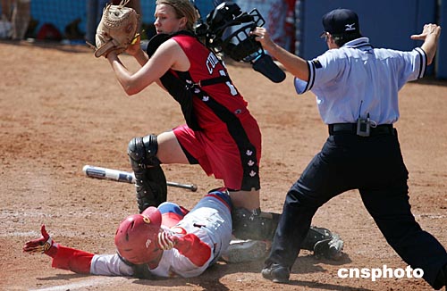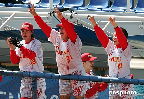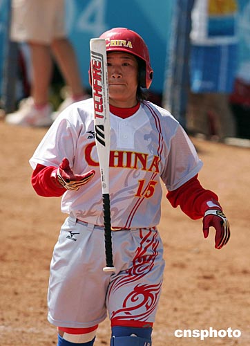 當(dāng)?shù)貢r間八月十六日,在雅典奧運(yùn)女子壘球比賽中,中國隊(duì)四比二戰(zhàn)勝加拿大隊(duì)。中新社記者:毛建軍