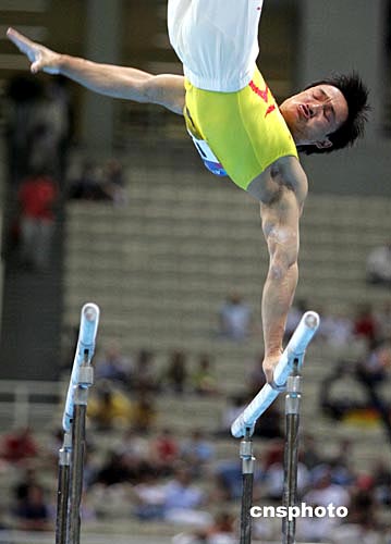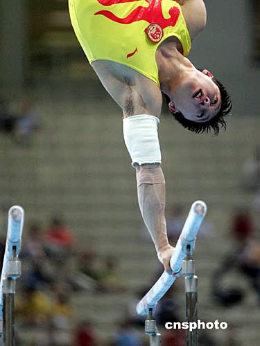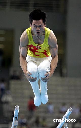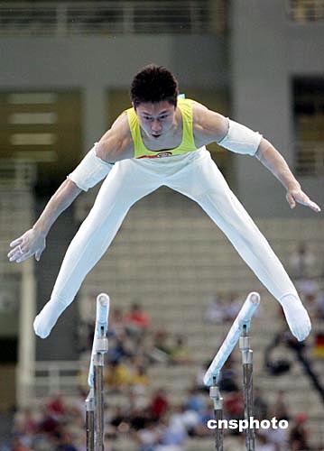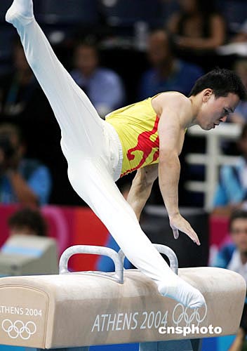 當(dāng)?shù)貢r(shí)間八月十六日晚,雅典奧運(yùn)男子體操團(tuán)體比賽在奧運(yùn)體操比賽館舉行,中國隊(duì)衛(wèi)冕失利,僅獲得第五名。中新社記者:毛建軍