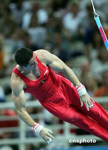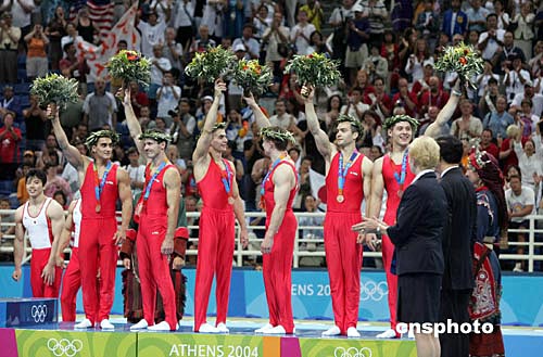 當(dāng)?shù)貢r(shí)間八月十六日晚,雅典奧運(yùn)男子體操團(tuán)體比賽在奧運(yùn)體操比賽館舉行,羅馬尼亞隊(duì)獲得銅牌。中新社記者:毛建軍
