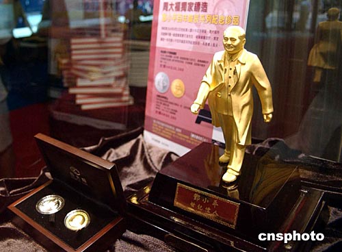 為紀(jì)念鄧小平一百周年誕辰,香港周大福金店向市面推出“鄧小平百年誕辰系列紀(jì)念珍品”,純金塑像及紀(jì)念金銀幣引人注目。作者:洪少葵
