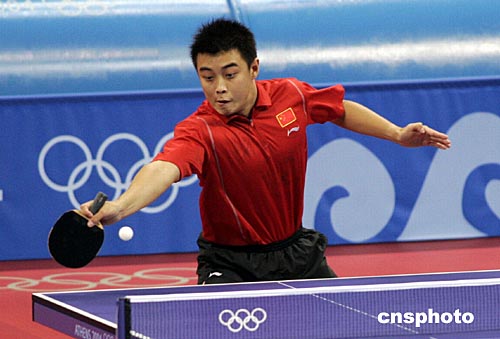 雅典當?shù)貢r間8月17日,首次參加奧運會的中國乒乓小將王皓以4比1打敗德國老將羅斯科夫,晉級男單第四輪。中新社記者:張煒