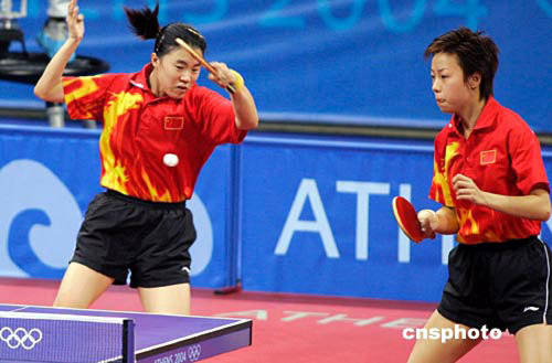 當?shù)貢r間八月十八日,在雅典奧運會乒乓球女雙1/4決賽中,王楠、張怡寧以4:2淘汰中國香港選手桑亞蟬、帖亞娜,率先晉級半決賽。中新社記者:張煒